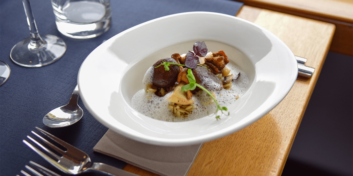Mushroom pie-Slow-cooked Lamb Shank, Baby potatoes with parsley and pak choiorGrilled Octopus, Chorizo Cream, Baby potatoes with parsley and pak choi-"Paris Brest" with Dulcey ChocolateorGourmet Dessert Plate